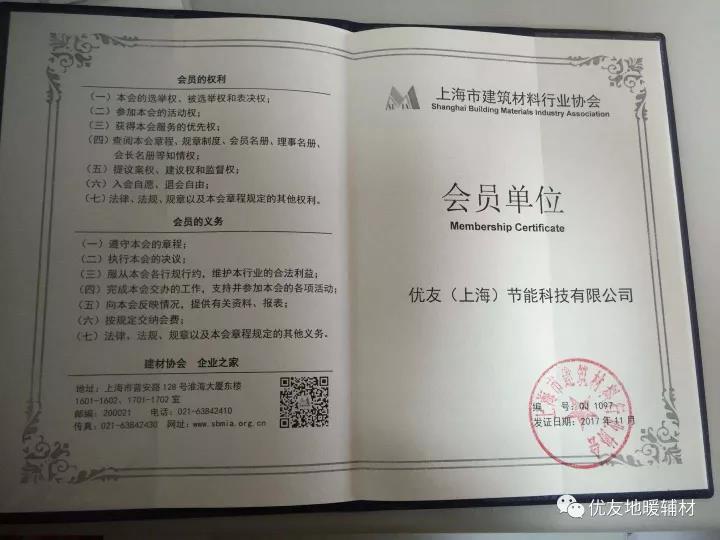 優(yōu)友地暖正式加入上海市建筑材料行業(yè)協(xié)會